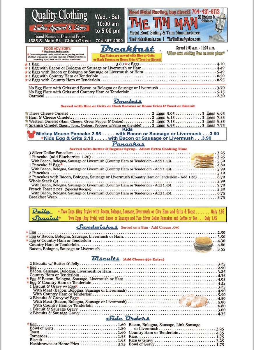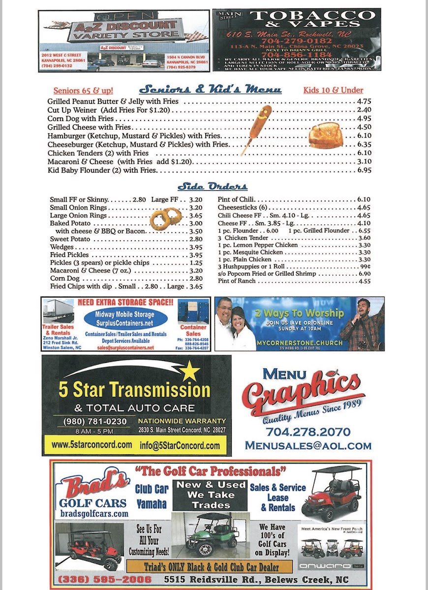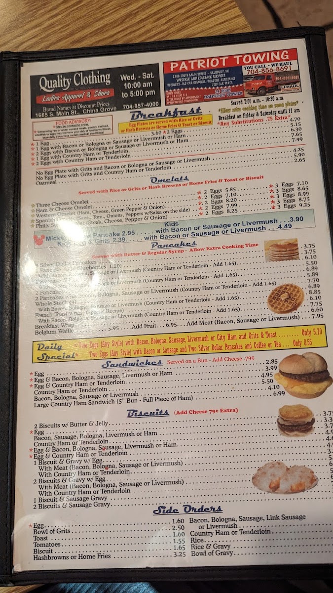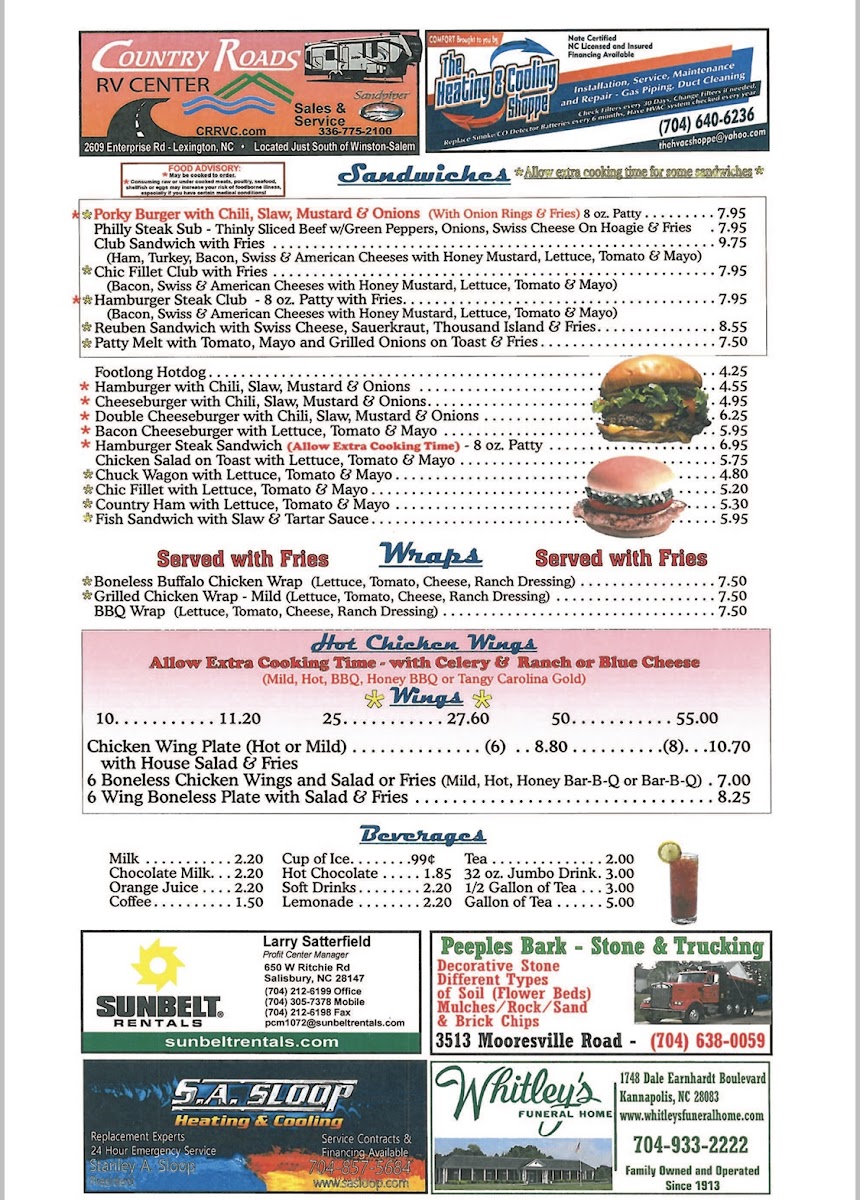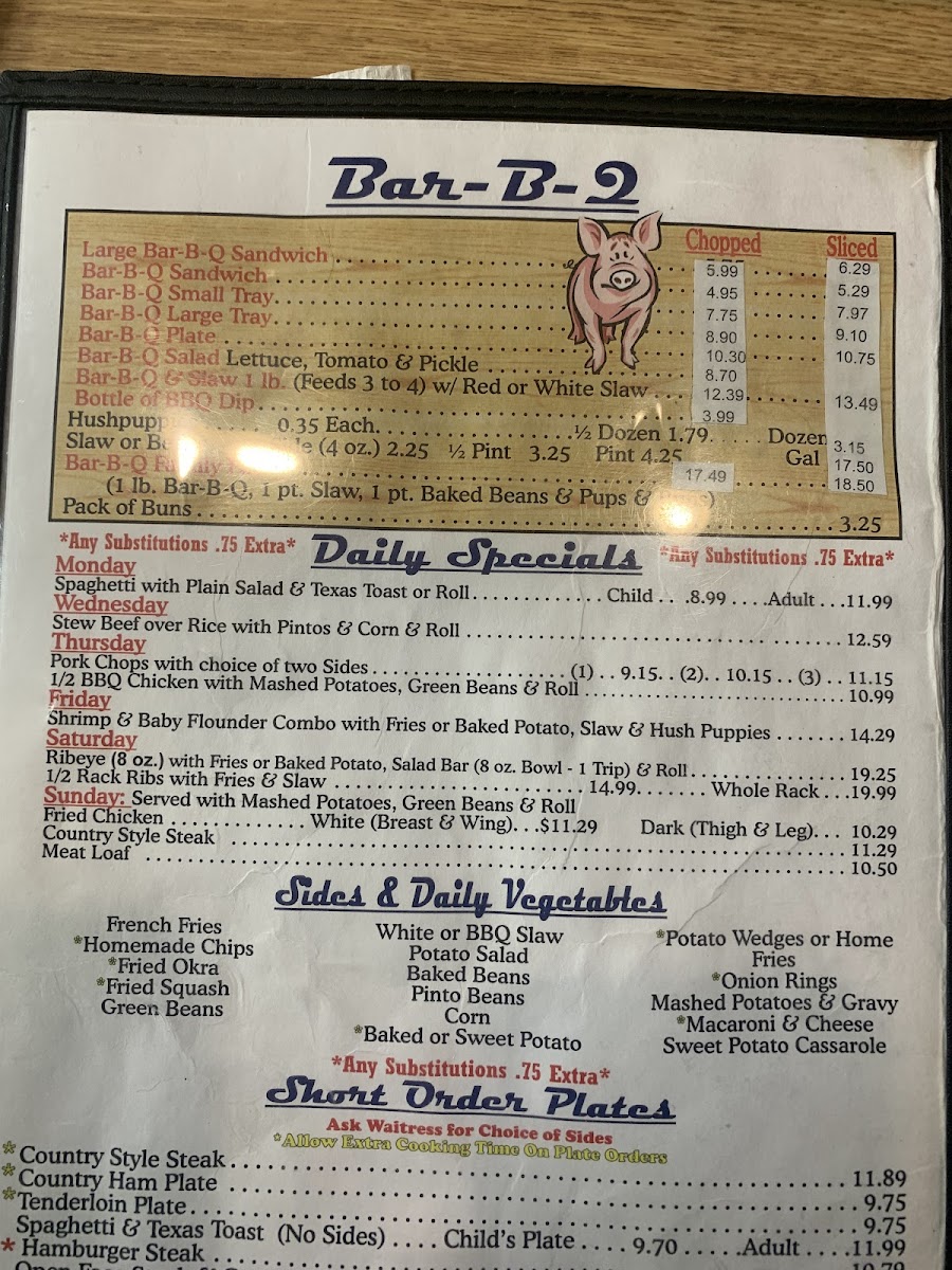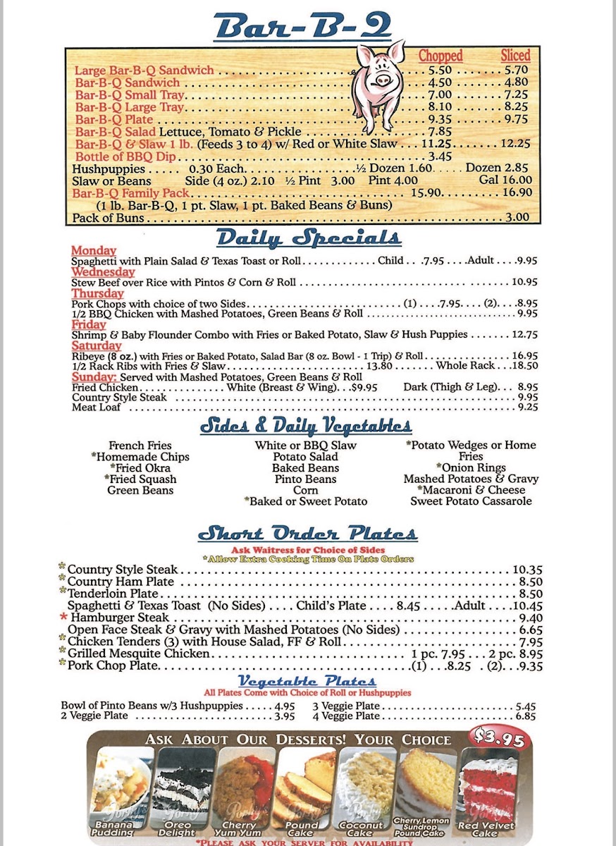 The menu features familiar favorites such as chopped pork barbecue plates and baby back ribs, alongside breakfast options like French toast and Western omelettes. Simple sides like hush puppies, large onion rings, and baked beans complement the main dishes, while house-made touches, including a flavorful ranch dressing and refreshing sweet iced tea, add to the welcoming atmosphere.
